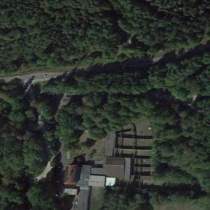 Dunkler Parkplatz mit viel Wald daneben