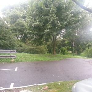 Hier treffen sich M F P TV TS . Die Einfahrt zum Parkplatz ist zwischen Friedhof und Brücke .