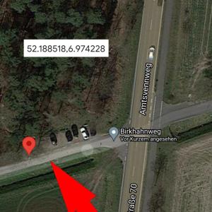 Aus Richtung Alstätte ca 2-3 km, links in den Birkhahnweg oder aus der anderen Richtung über die B54 , die Ausfahrt auf B70 nutzen, Richtung Alstätte/Vreden abbiegen. Die nächst rechts. Der Parkplatz liegt direkt auf rechten Seite