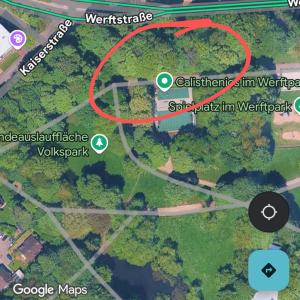 Oben am Basketballfeld. Es gibt eine Ecke im Gebüsch zur Werftstraße